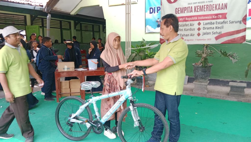 Gempita kemerdekaan dalam rangka hari ulang tahun (HUT) Ke-78 Kemerdekaan Republik Indonesia di SMPN 4 PARE Semarak kegiatan 17 Agustus 2023 berlangsung di hadiri oleh Kepala Sekolah, Bpk/Ibu guru, stap dan karyawan beserta siswa siswi tanpa terkecuali. Acara demi acara Gempita Merdeka diawali dengan beberapa kegiatan diantaranya:(1) Estafet air, (2) Estafet kardus,(3) Tahan air,(4) Estafet sarung,(5) Drama kecil, dan ( 6) Jalan sehat. Kegiatan demi kegiatan hingga tiba pada acara puncaknya yaitu jalan santai. Dengan di dampingi panitia dari OSIS serta pemantauan dari bapak ibu guru semarak Gempita Kemerdekaan berlangsung dengan meriah dan antusias. Diacara yang paling di tunggu – tunggu jalan sehat tgl 02 September 2023. Door preis dan undian karcis sehat. Siswa siswi SMPN 4 Pare semangat mengikuti puncak acara hingga penutup acara.Tiba Saat undian karcis tiba suasana riuuh dengan hati yg tak menentu ternyata hadiah yang sepeda penunang belajar diterima siswa putri kelas 7.D..Dengan berakhir penyerahan hadiah dari Bpk Nur Subiantoro,S.Pd.M.MD.. Maka berakhirlah kegiatan Gempita Kemerdekaan yg mulai tgl 28 Agustus hingga 02 September 2023.